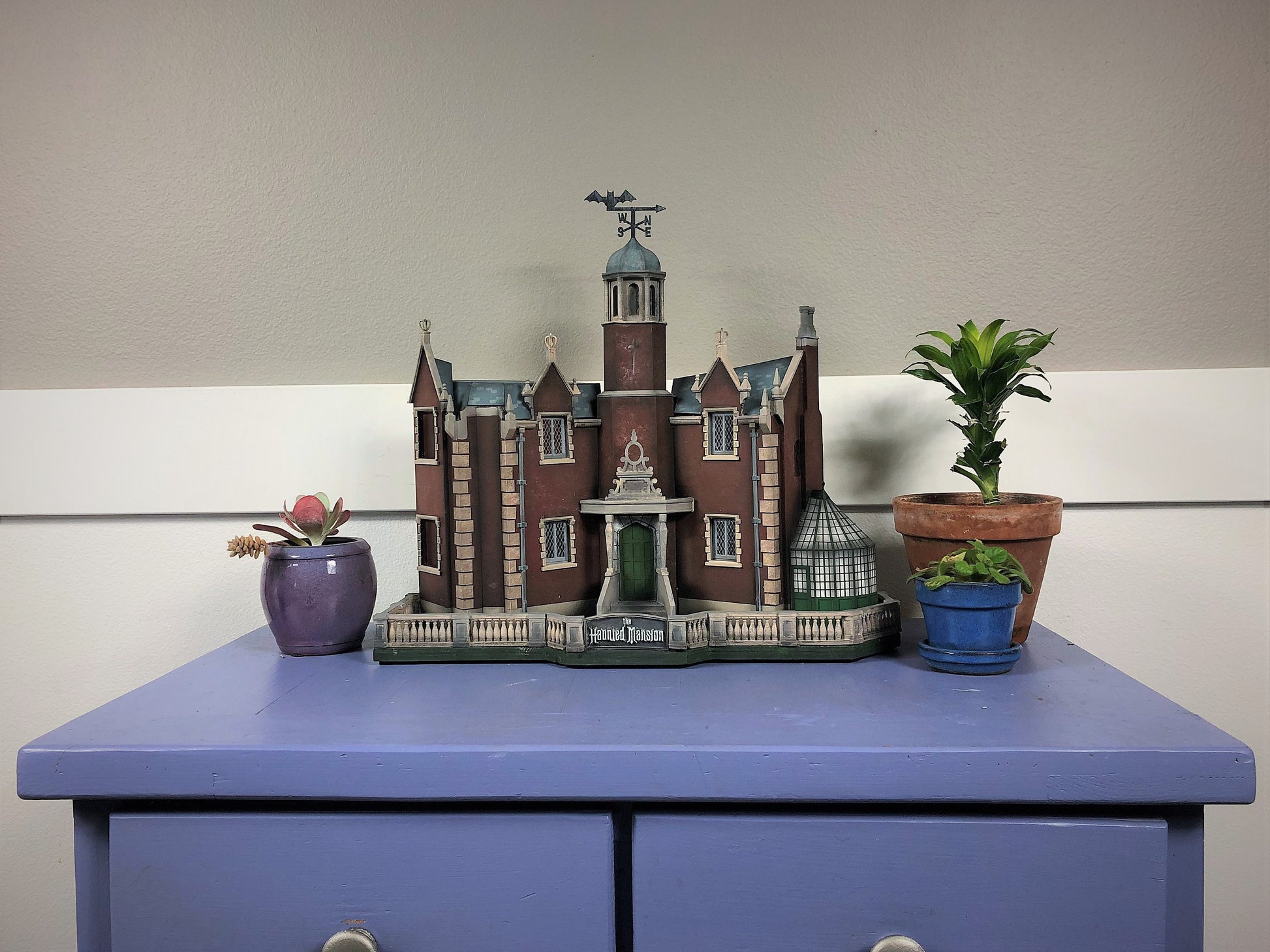 This is a faithfully designed replica of the Walt Disney World and Tokyo Disney version of the Haunted Mansion attraction. Handmade and painted with over 100 separate parts. Every detail is here, even the bat on the weathervane. The mansion sits on a wooden base surrounded by detailed balustrades and a themed plaque.