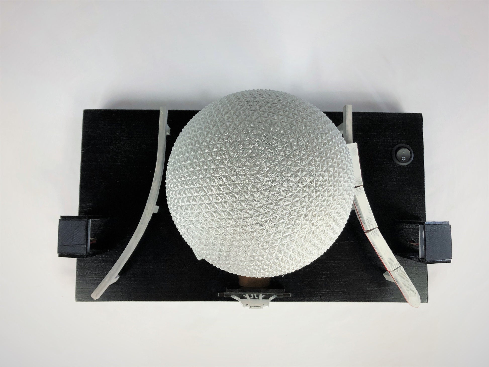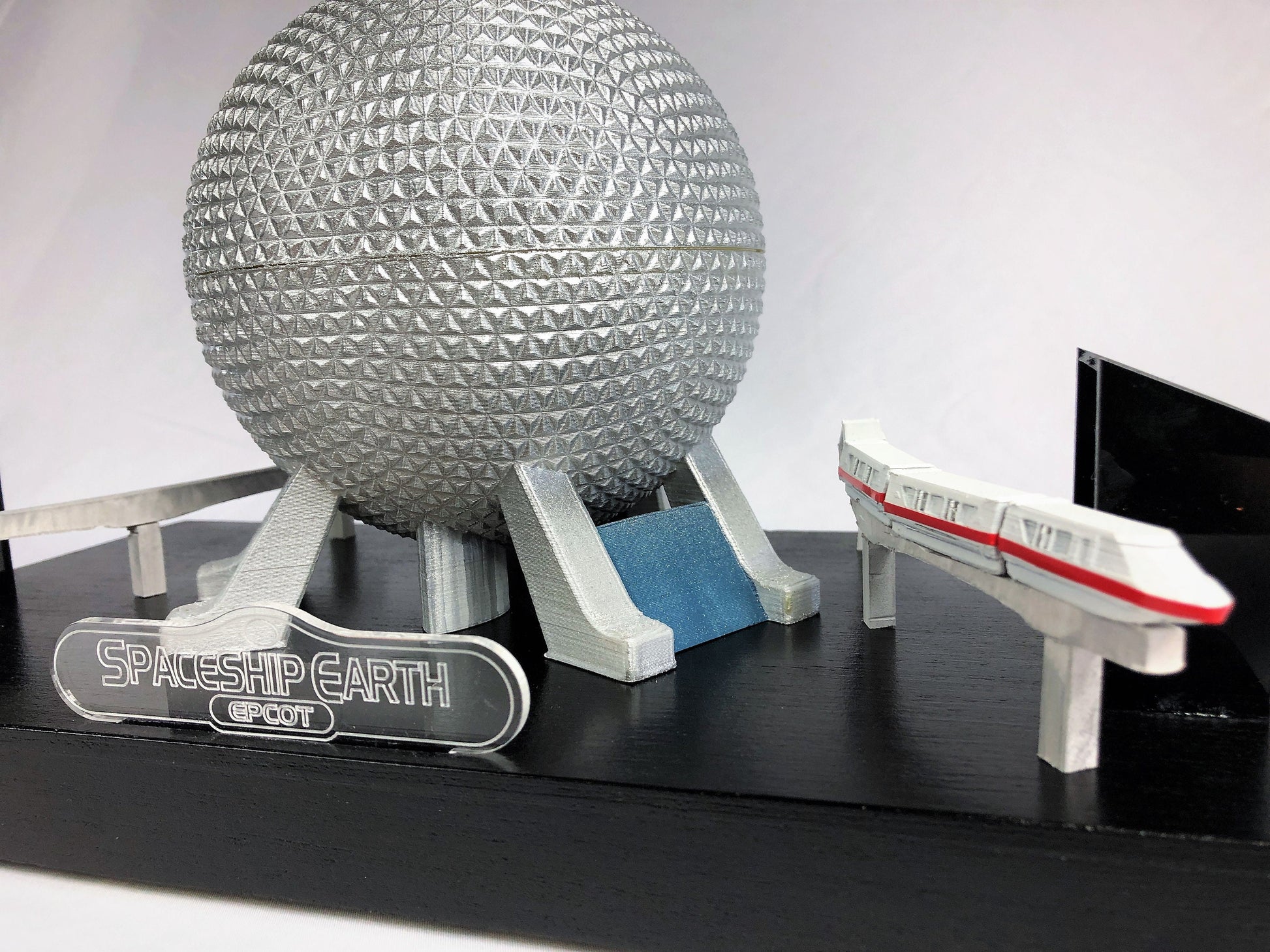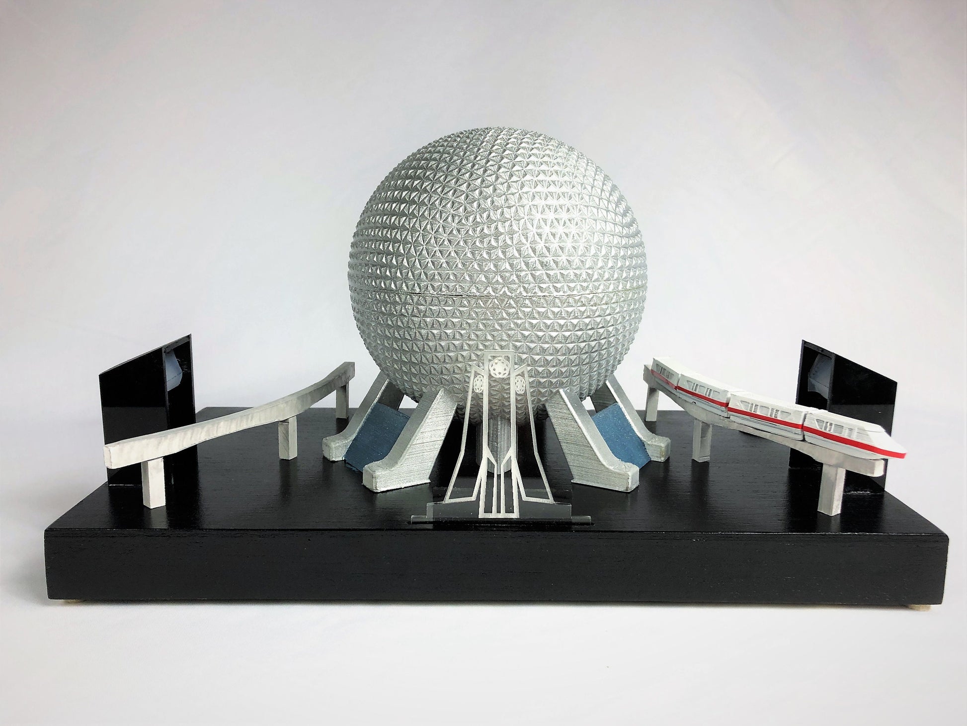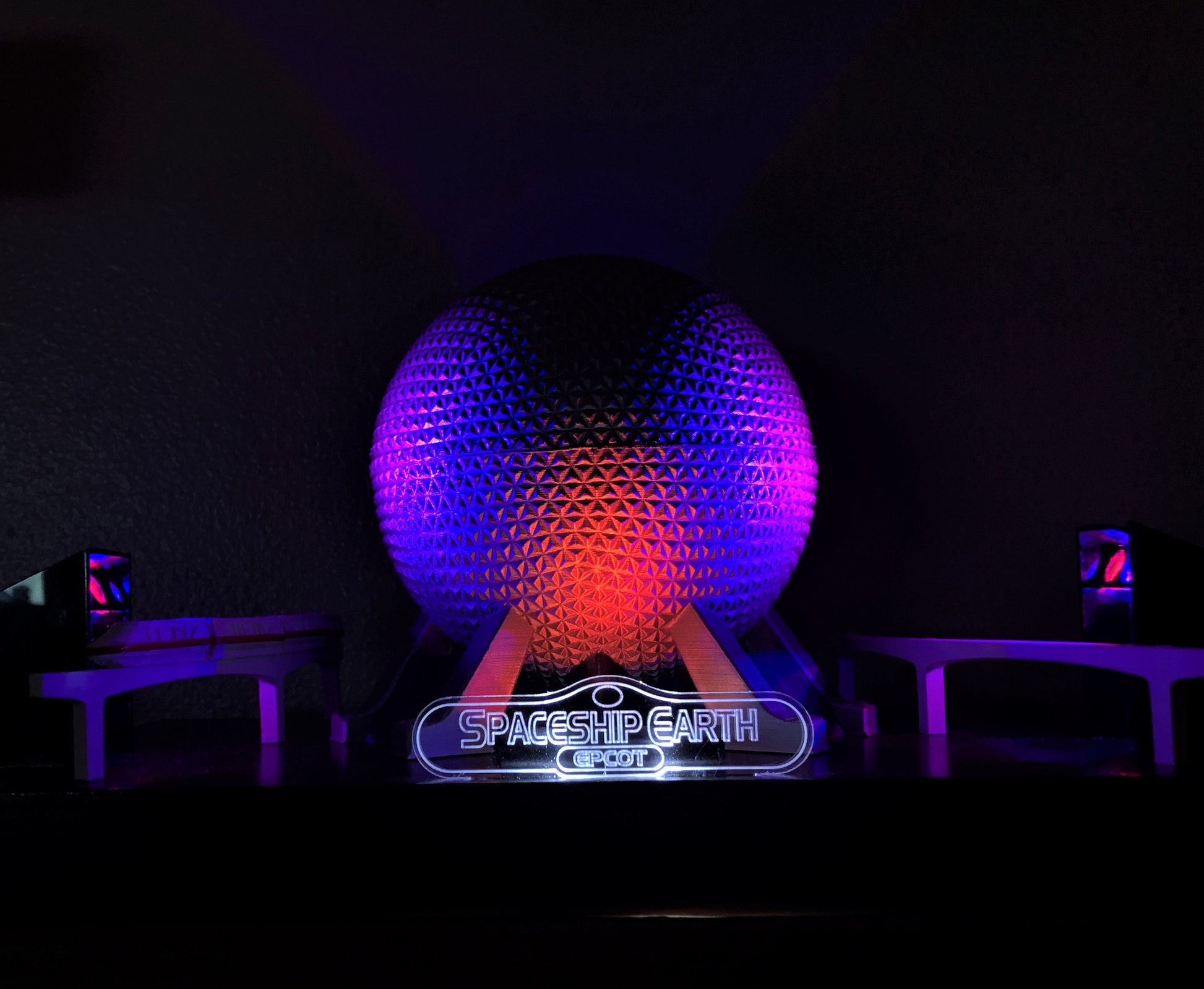 This stunning scale model is more than an accurate rendering of the most recognized geodesic sphere in the world. It captures the full excitement of EPCOT as you disembark monorail red and head through the main entrance towards Spaceship Earth. Just like the real thing, this piece shows its true beauty at night. With 8 separate LED light sources and 5 different colors, the sphere is bathed in the familiar purples and oranges, while the clear acrylic fountain pillars or attraction sign (both included!) pop with a brilliant white.